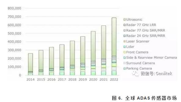 图5 和图6 分别是市场调研机构 IHS 对于未来全球ADAS功能装车量和传感器数量发展的预计。